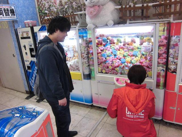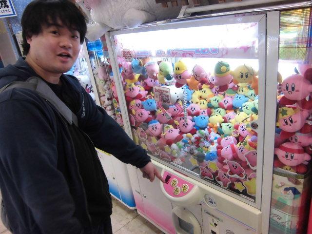 夕食は駅周辺で適当なものでも食べようと思い,駅周辺の商店街を散歩してみました.ゲームセンターがあったので,ちょっと入って中を覗いてみるとどこかで見たことのあるヒトが星のカービィの人形を取るクレーンゲームをやっていました.