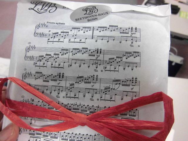 ミーティングが終わって,雑談モードになってからベートーヴェンハウス博物館のパンフレットとベートーヴェンの有名な曲集の CD をもらいました.包装されている紙は,ベートーヴェンのピアノソナタ月光の第三楽章が書かれていて,おおっと思いました.ベートーヴェンハウス博物館はいつか行ってみたいところの 1 つです.