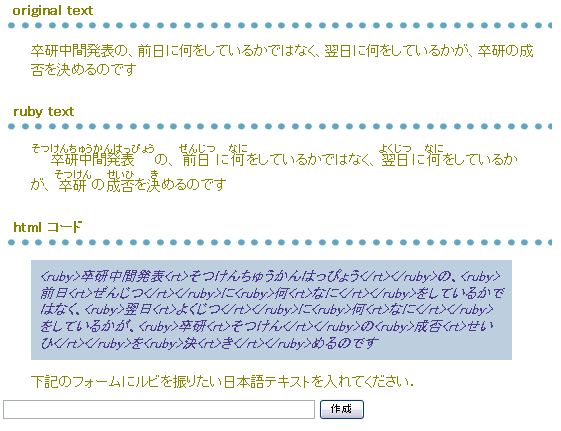 上記のページではフォームにルビを振りたい日本語テキストを入れると html コードを出力します.